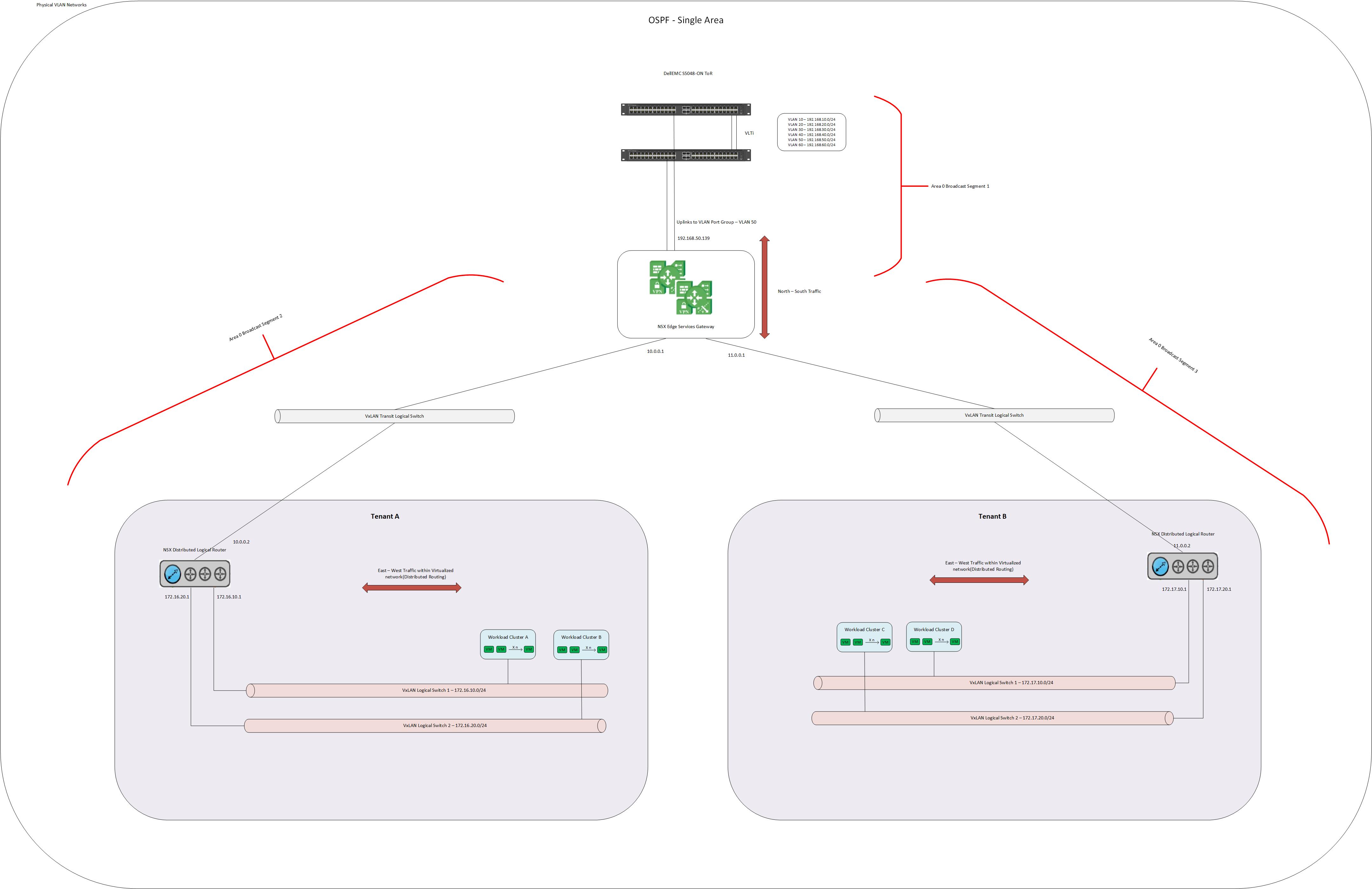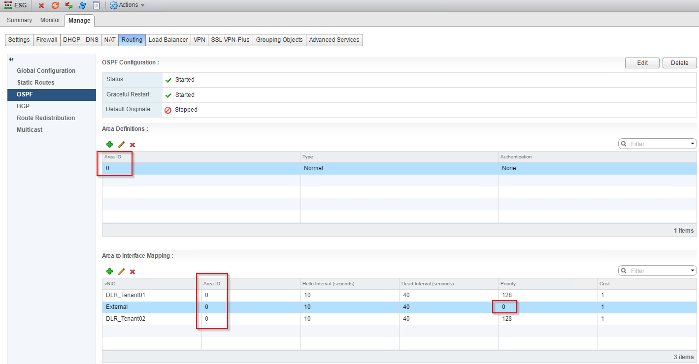 Here, the physical infrastructure, NSX ESGs and all the DLRs for the Tenants are in a single OSPF area 0 (The backbone area).