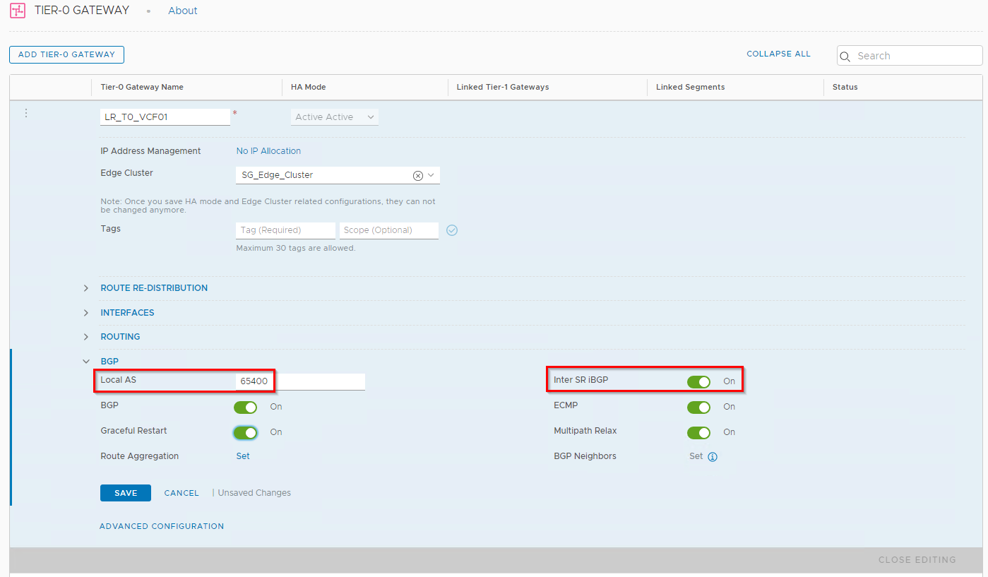 We will configure BGP on the T0 Gateway with a different ASN to establish eBGP peering. With Version 2.4, T0 Gateways also support iBGP peering, but the decision depends upon the architecture. iBGP peering usually requires a full-mesh connection to overcome the Split-horizon phenomenon with iBGP neighborship. We will use ASN 65400 for the T0 Gateway and eBGP peer it with the ToR VLT switches (which are on ASN 65500). Since T0 Gateway has two Uplinks each one via separate Edges, we will have two eBGP peerings.