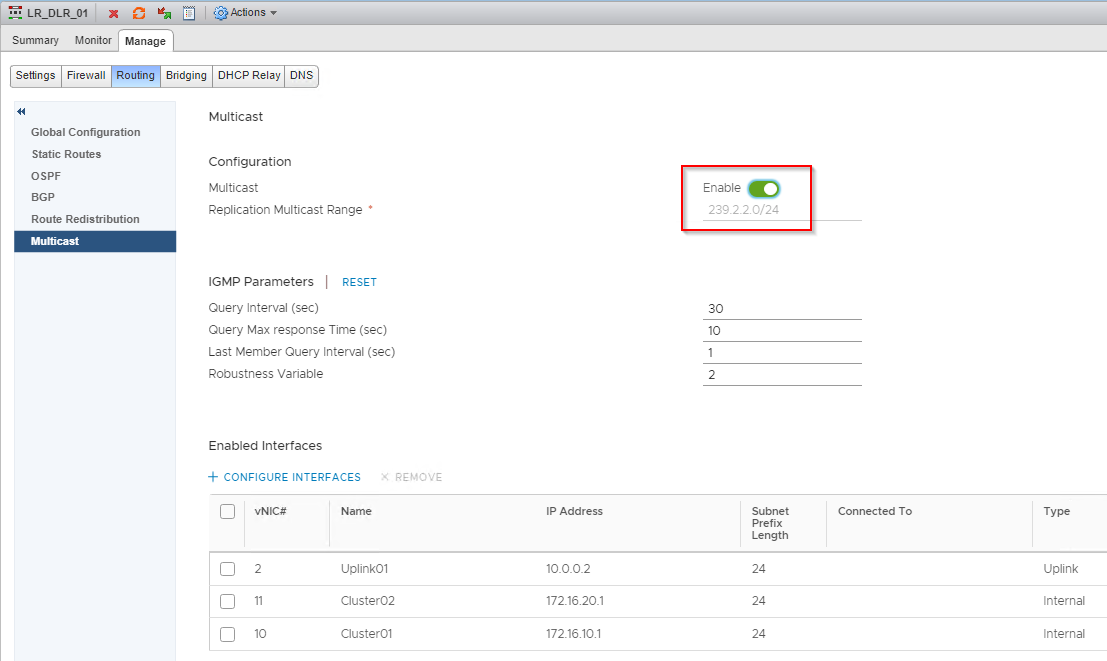 Unlike ESG, DLR doesn’t have support for PIM Sparse mode. Enable Multicast Routing using the Toggle button. Specify the Replication Multicast Range based on the groups that we need to subscribe for and this should be outside the range used under the Transport zone for BUM Replication.