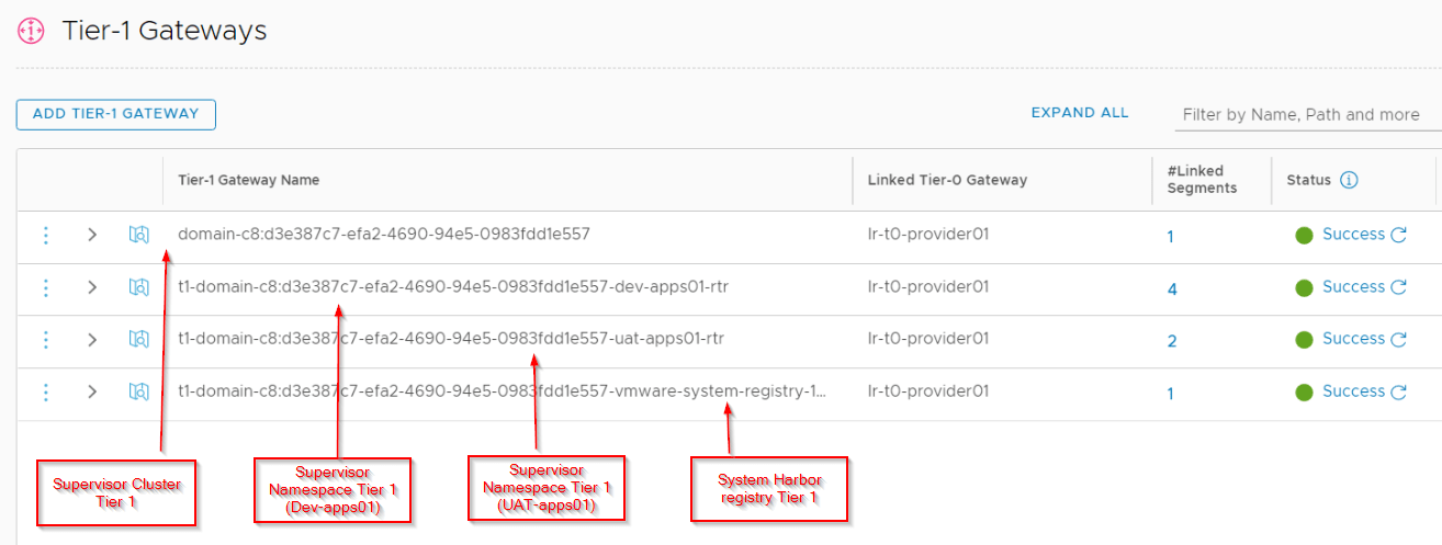 • This logical segment where the Supervisor VMs are attached is connected to a Tier1 Gateway called the cluster T1 Gateway. In the figure it is labelled as “Tier-1 Gateway for the supervisor cluster”. Other Supervisor namespace segments wont connect to this Cluster Tier 1 Gateway.