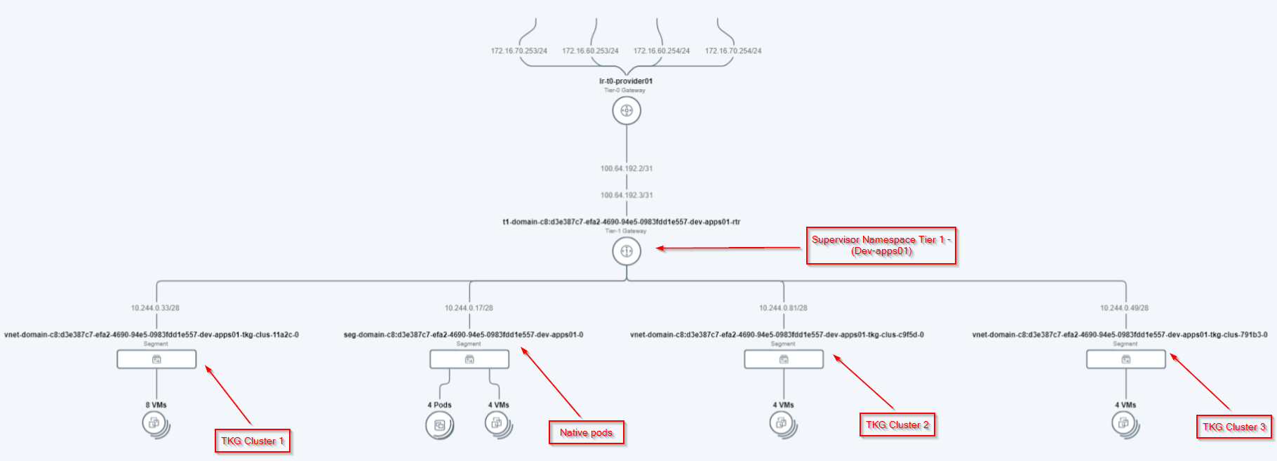 • All these segments (1001-1020) attach to a Tier1 Gateway called the Cluster T1 Gateway. In the figure it is labelled as “Tier-1 Gateway for the supervisor cluster”.