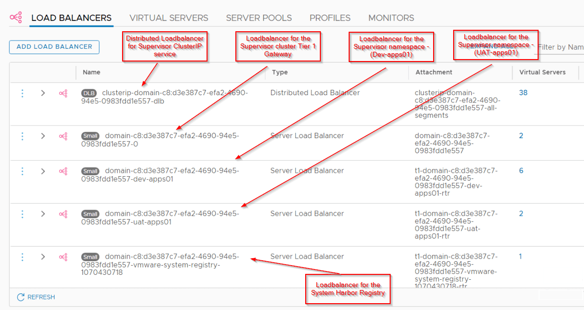 • The load balancer provisioned on this Cluster Tier1 Gateway provides Ingress access to the Supervisor cluster kubeAPI, Harbor UI and the applications deployed as native pods on all the supervisor namespaces. All services of type “loadbalancer” is realized as a L4 VS and services of type “Ingress” is realized as an L7 VS on this loadbalancer. This can also be seen as a Shared Tier-1 Gateway.