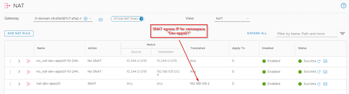 • There is no 1:1 mapping between Namespace tenants and SNAP egress IPs. This is because the TKG clusters deployed in the Supervisor namespace has their own dedicated SNAT IPs.