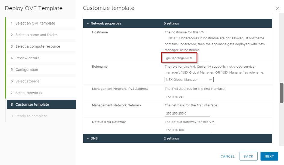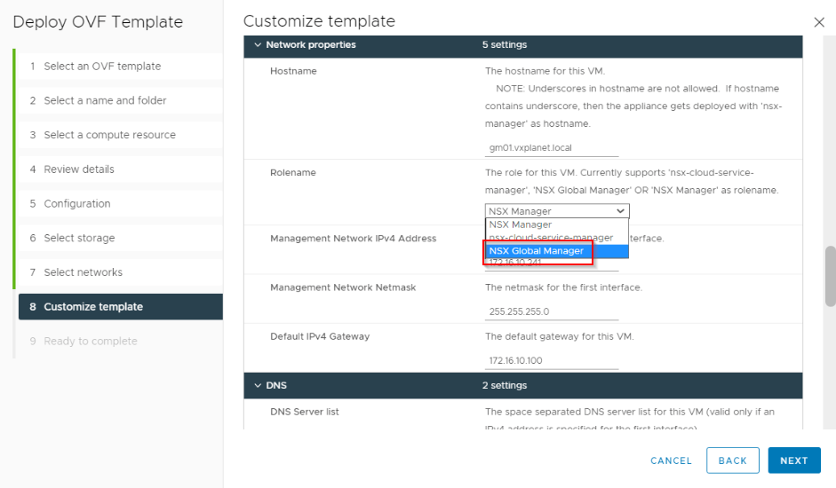 Global manager is deployed using the same ova template that is used to deploy the local managers with the role selected as ‘NSX Global Manager’. Active Global manager cluster is chosen to be on Site A.