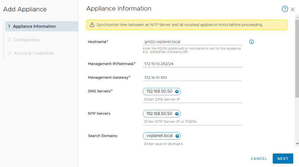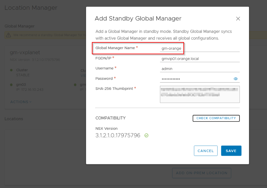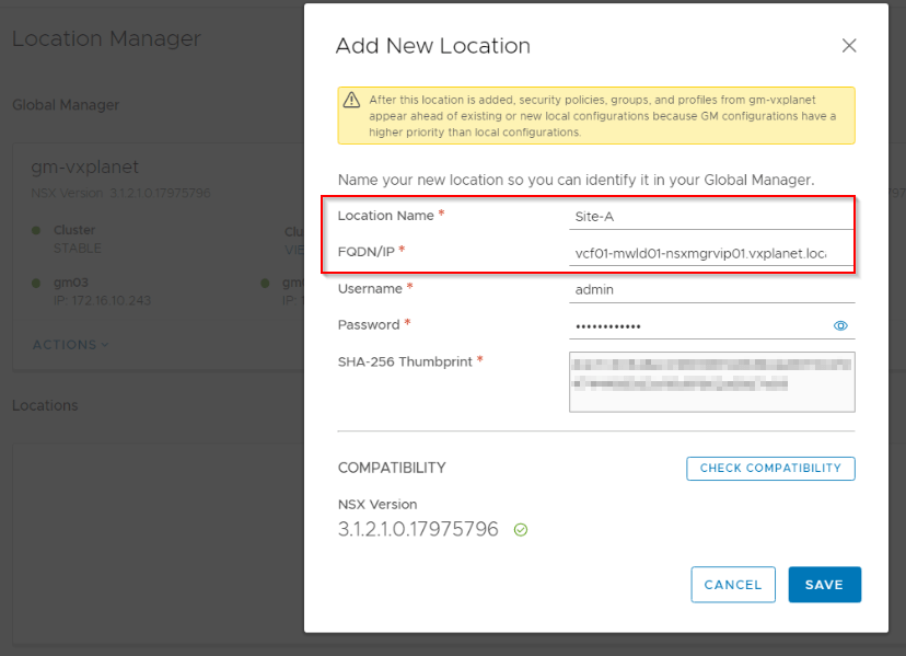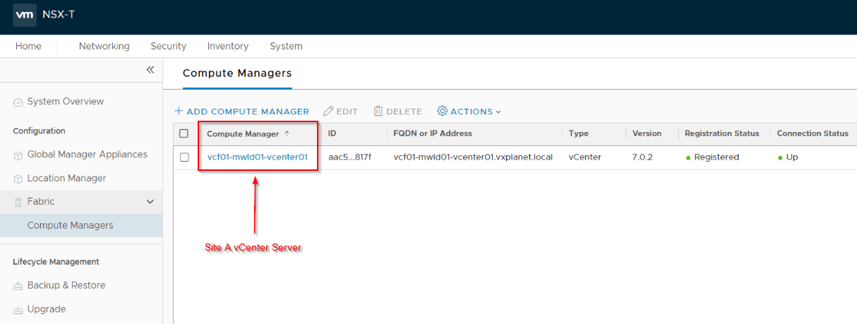 Once the GM is deployed, add Site A vCenter server as a compute manager to GM. This is needed to orchestrate the deployment of additional nodes of the GM cluster.