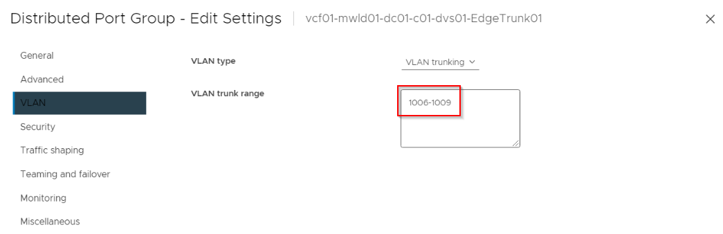 Choose the RTEP VLAN (based on the IP schema we discussed earlier – For Site A, it is 1009). We do have an option to apply a named teaming policy, so that the RTEP traffic can be steered over a specific edge uplink.