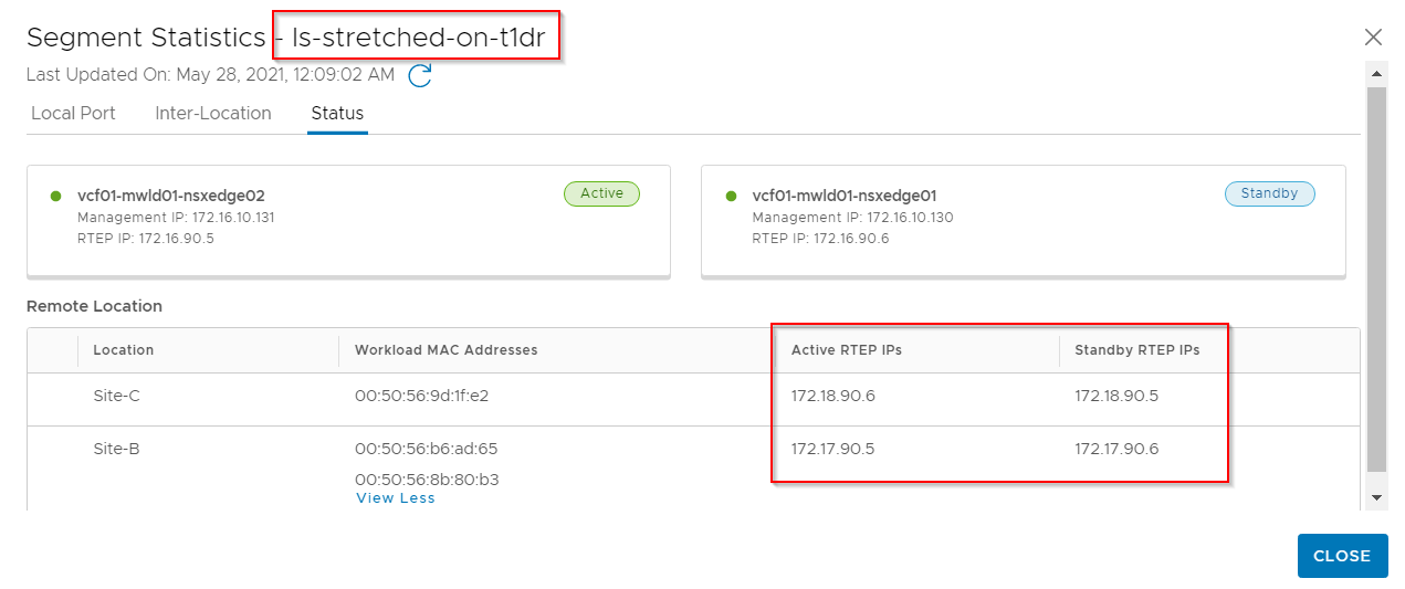 Below is the L2forwarder details of a segment that is stretched across all the three locations. For eg, if a VM on site A needs to communicate with a VM on Site B on the segment ‘ls-stretched-on-t1dr’, the intersite traffic will be tunneled between 172.16.90.5 (RTEP Edge Site A) and 172.17.90.5 (RTEP edge Site B)