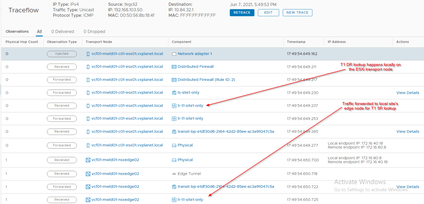 Note that traffic has been forwarded to the primary location (inter-site RTEP tunnel) for egress. As discussed previously, we can’t capture inter-location traceflow results, hopefully it will become available in the future releases.