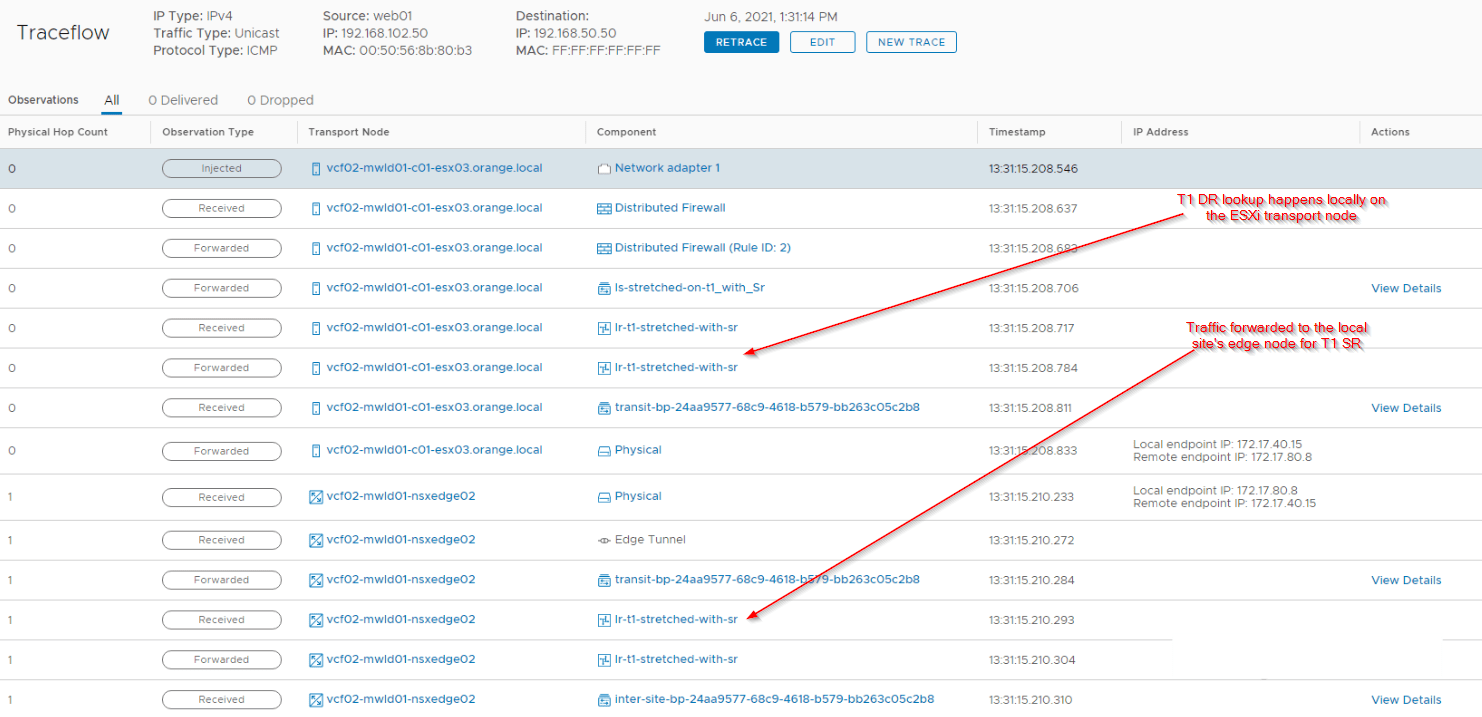 Notice that even though both VMs are in the same ESXi transport node in the secondary location, traffic needed to cross to primary location to complete the T1 SR lookup.