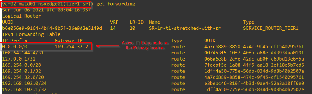 In this scenario (as discussed in Part 4 – Scenario 1), we have few customer networks that are local to Site B (secondary location). The primary location’s T0 SR forwarding table will next hop to the secondary location for egress to these networks.