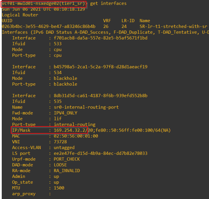 and this is the interface details of the Active T1 SR edge node on the primary location.