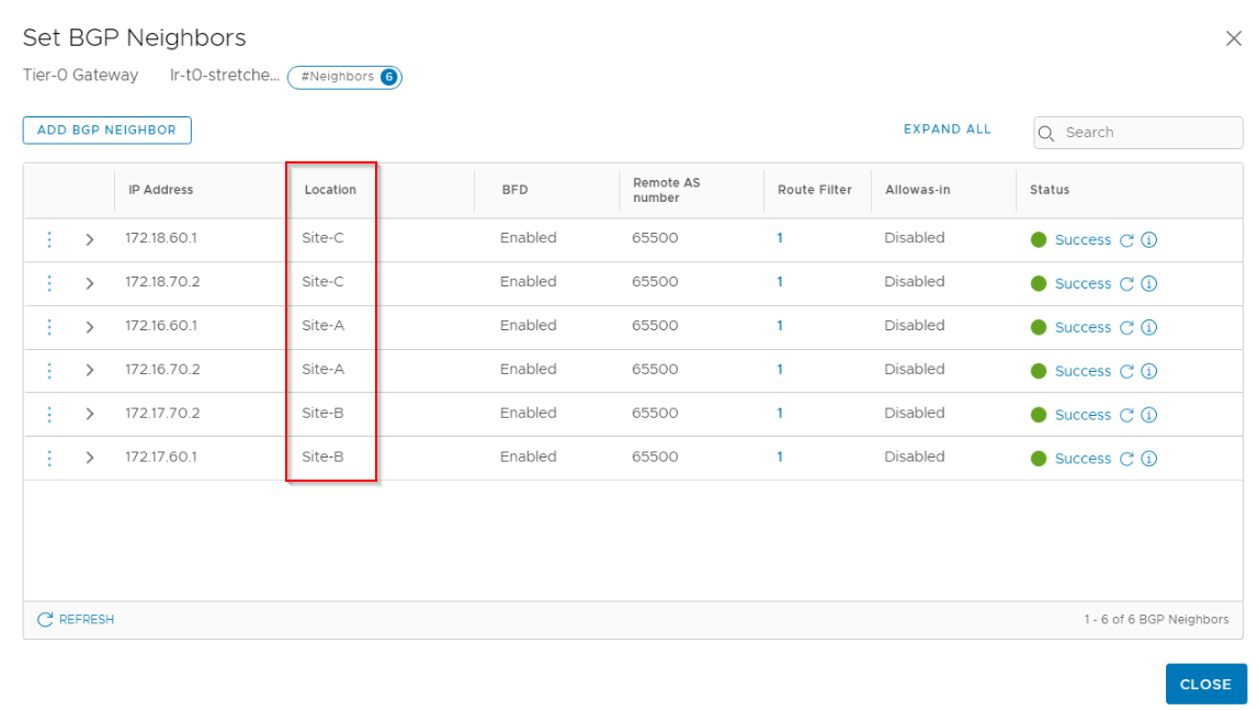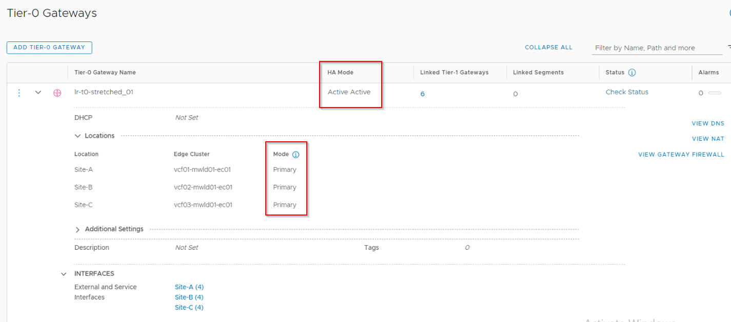 The stretched T0 gateway is deployed in Active-Active mode with span across all the three locations in ‘All-primary’ topology. Currently only Active-Active T0 gateway supports ‘All-primary’ topology.