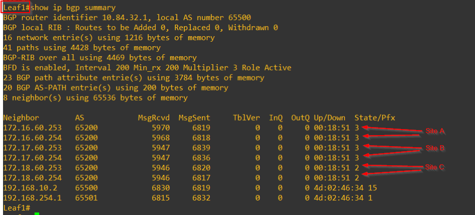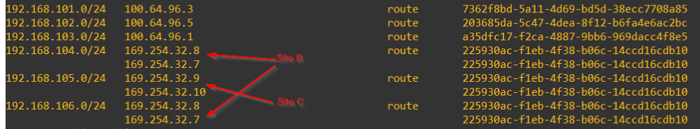 For eg: Site B has a local customer network 10.84.32.0/24 which is reachable over it’s Leaf switches. Site A and C will adjust their next-hops to Site B for reachability.