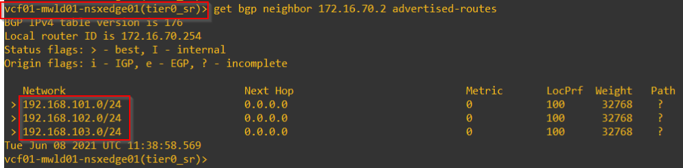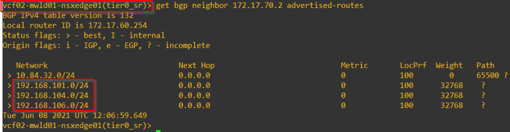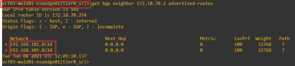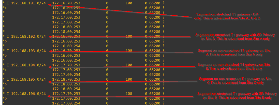 As discussed, each location will advertise only their local prefixes. This includes local T0 subnets, local stretched T1 (DR only) subnets, stretched T1 (with SR) subnets with primary on that location and unstretched T1 gateway subnets on that location.