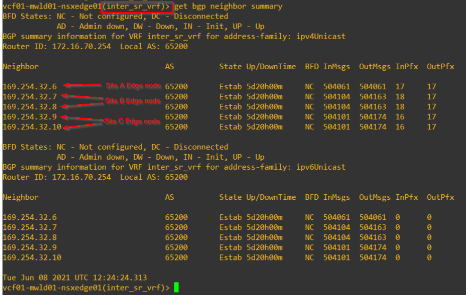 Below is the inter-SR peering established between intra-site edges and inter-site edges on Site A. We have the same peering on all other locations as well.