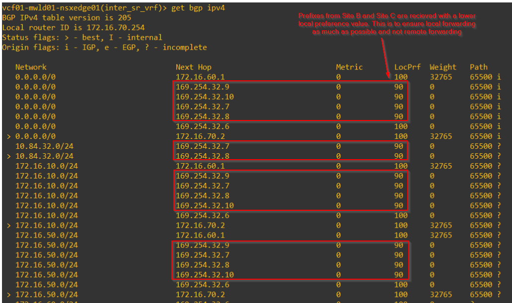 This is the inter-SR bgp table from Site B which also receives prefixes from other locations with a lower local preference and has local egress.
