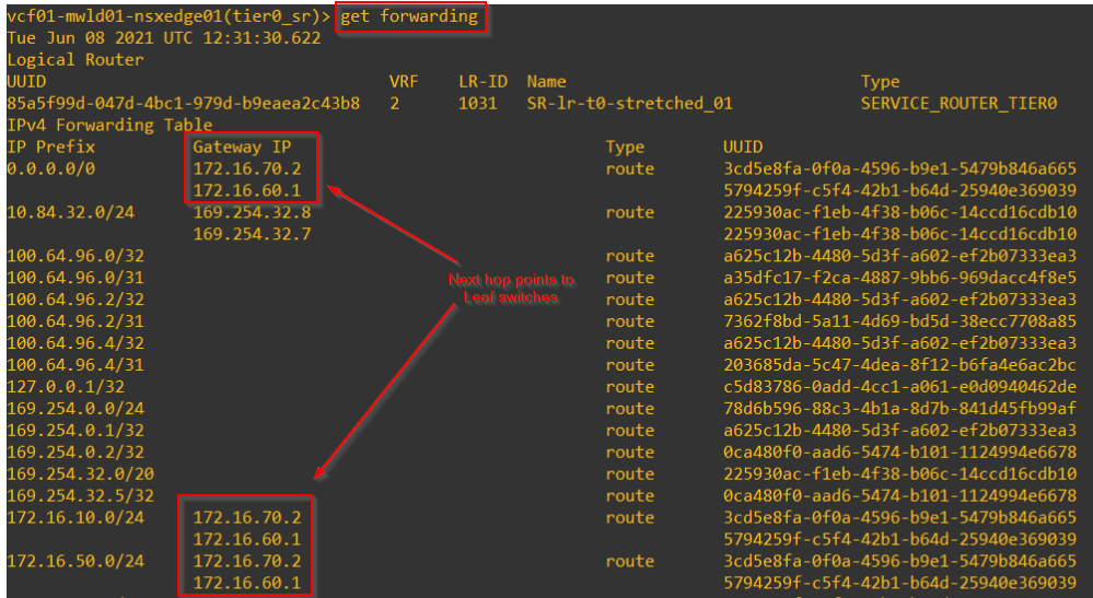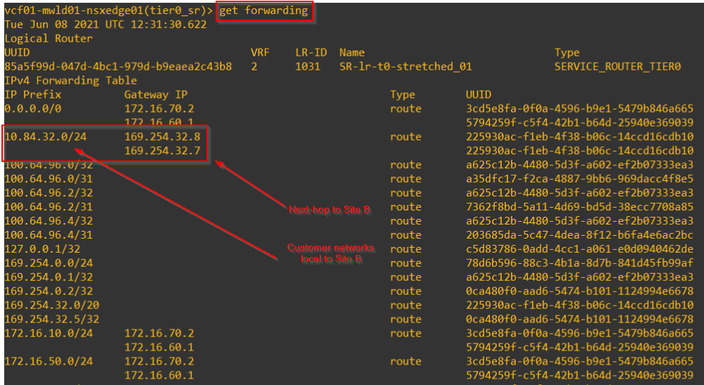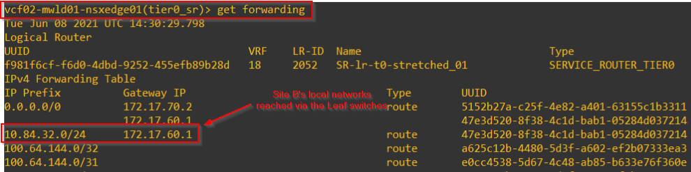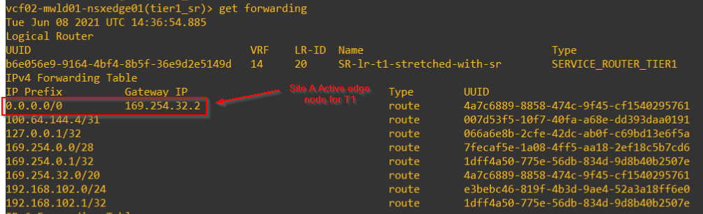 The placement of stretched T1 gateway’s primary location will influence the egress locations as well. For eg: If we have a stretched T1 with SR on Site A as the primary location, all segments downstream to this T1 irrespective of the location, will have Site A as the egress location. Below is the next-hop from Site B Stretched T1 SR that next-hops to Site A