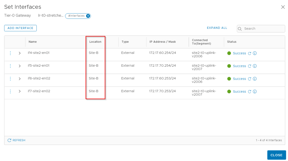 The T0 gateway has 4 uplink interfaces in each location, thereby making a total of 12 across all the three locations. Interfaces (and all global objects) are realized on the local managers based on the span and as such one location doesn’t received the configuration for another location. Below ae the interfaces realized on Site B. The IP/VLAN schema for locations were already discussed in Part 1.