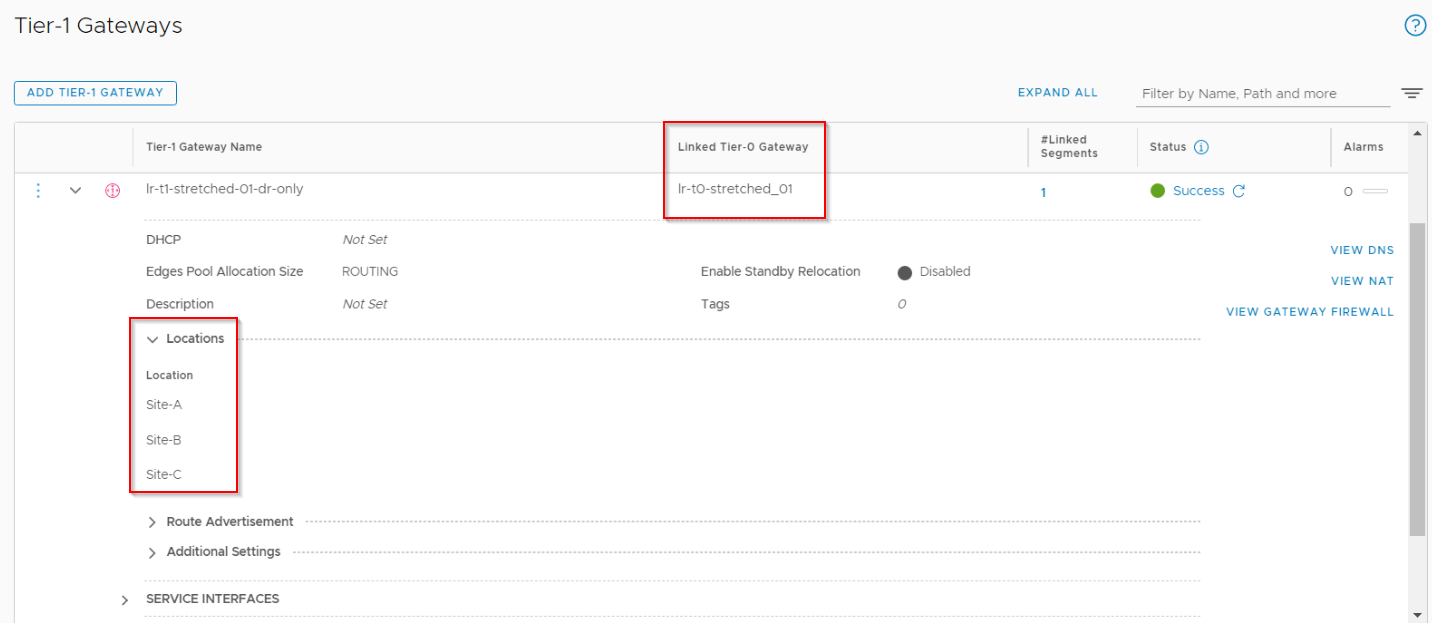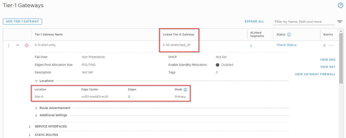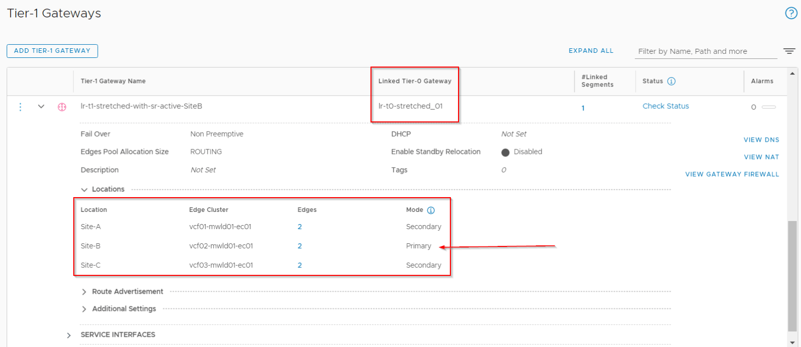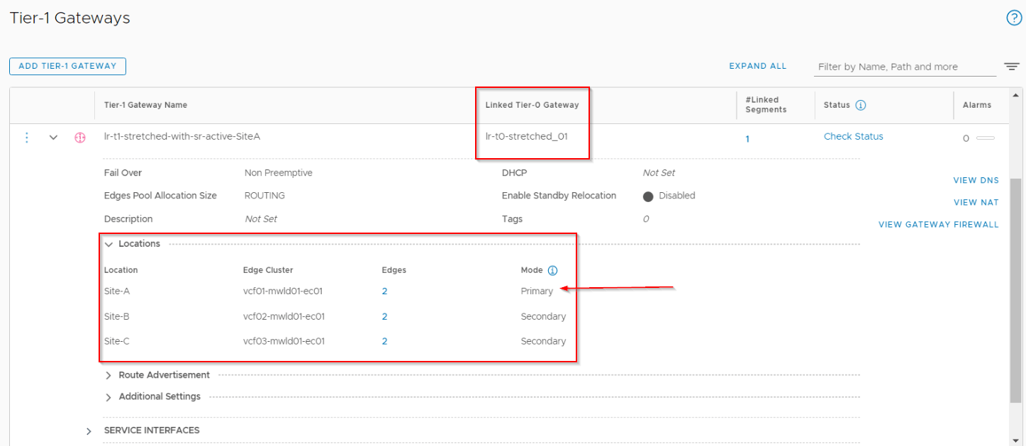 - Stretched Tier 1 Gateway with SR – (lr-t1-stretched-with-sr-active-SiteA) – Span across all locations with Site A as primary