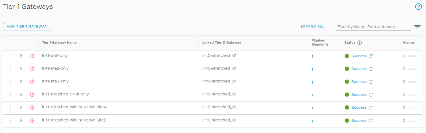 - Stretched Tier 1 Gateway with DR only – (lr-t1-stretched-01-dr-only) – Span across all three locations