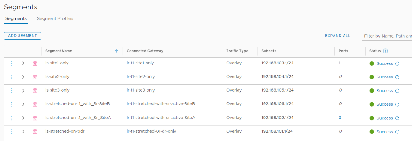 - Segment attached to Tier 1 gateway in site A only (192.168.103.0/24) – ‘ls-site1-only’