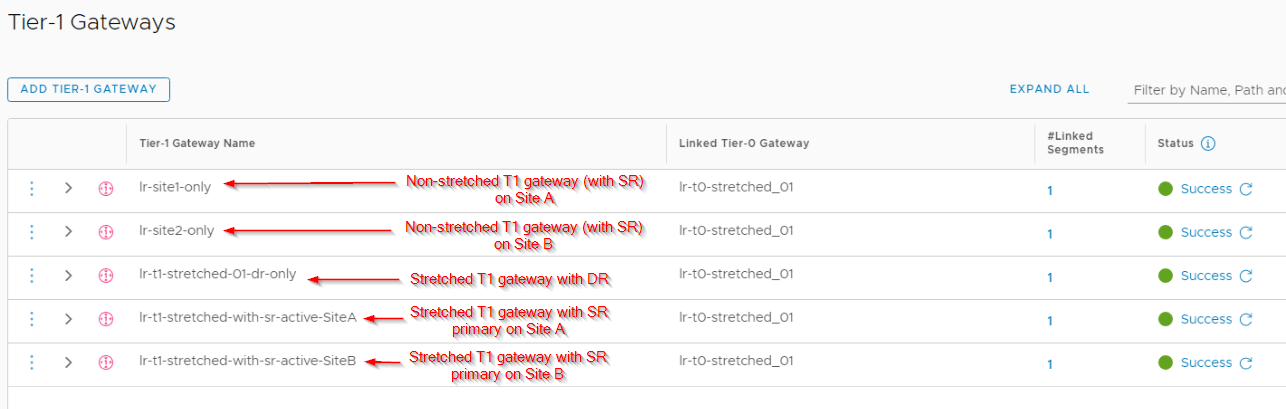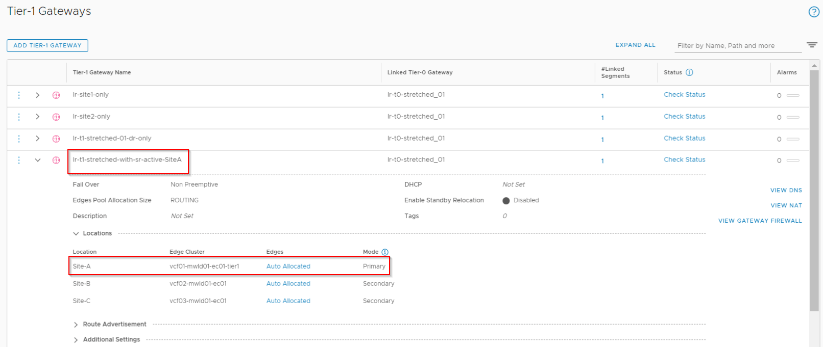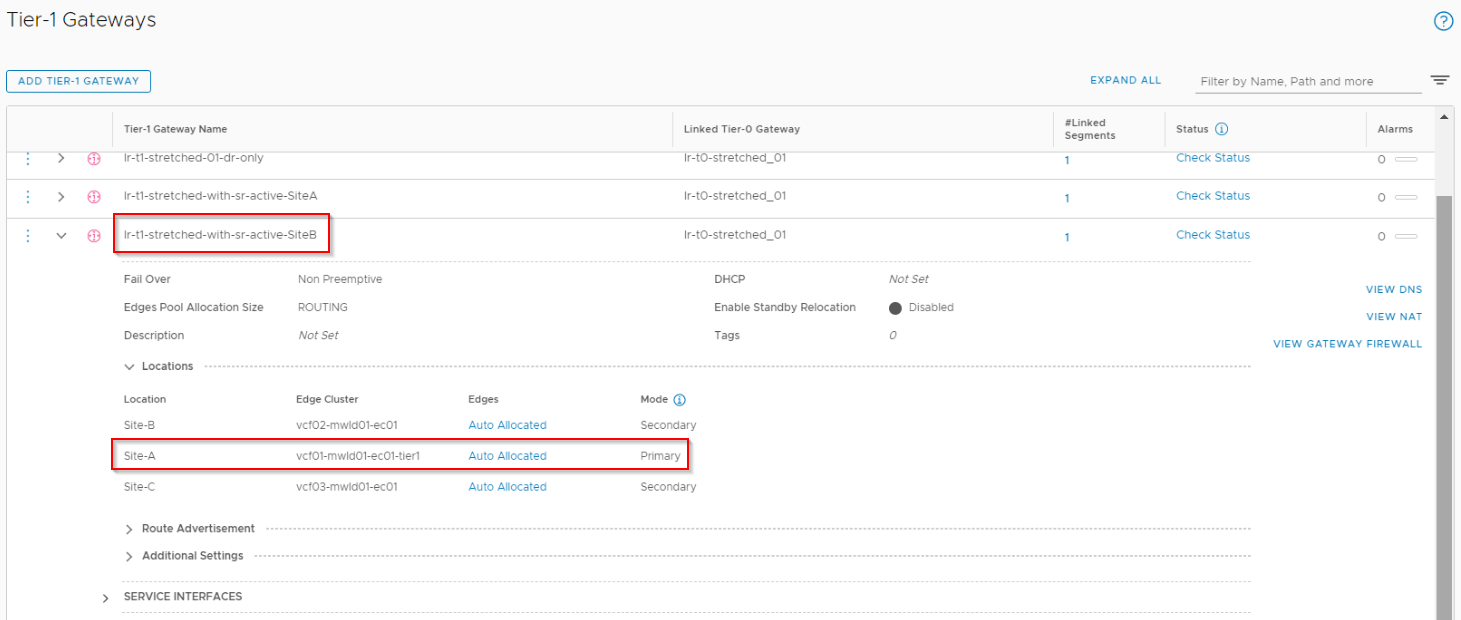 - Stretched Tier 1 Gateway with SR primary on Site A (co-located with T0 primary) with span across all locations (lr-t1-stretched-with-sr-active-siteA)