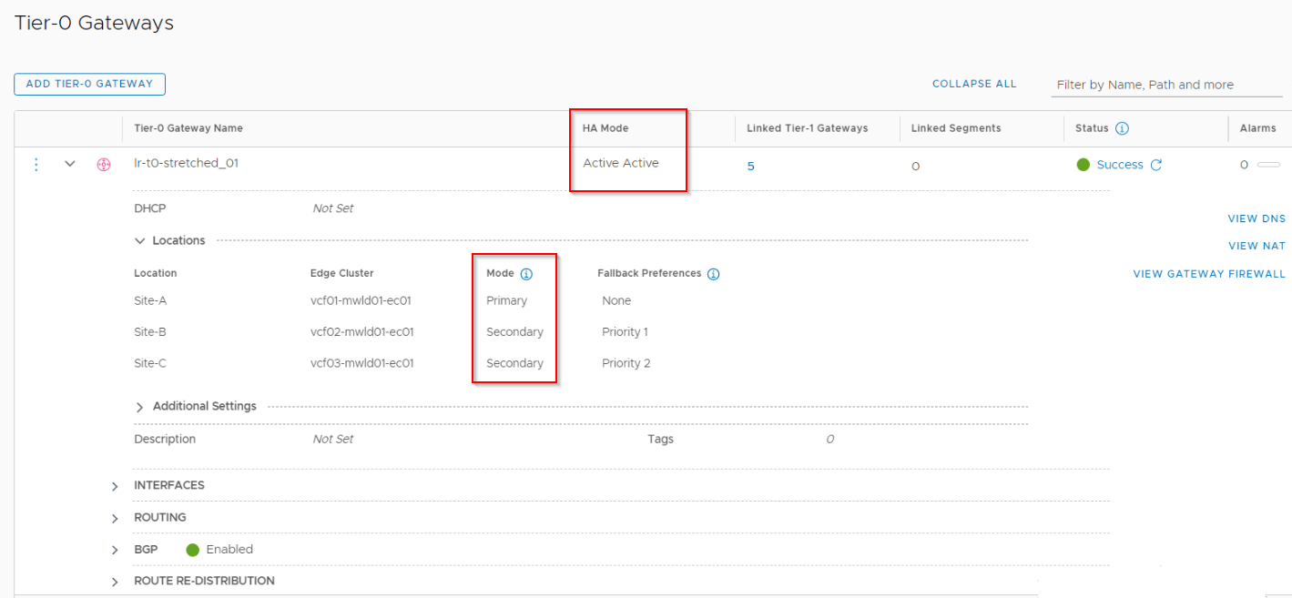 - Stretched Active-Active Tier 0 Gateway with location Primary-Secondary