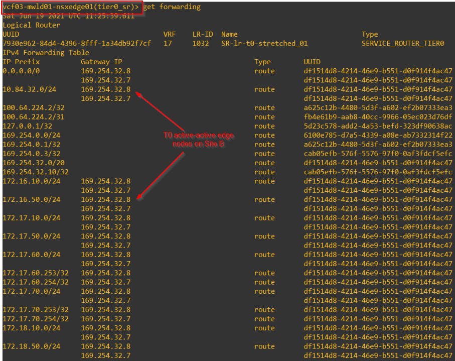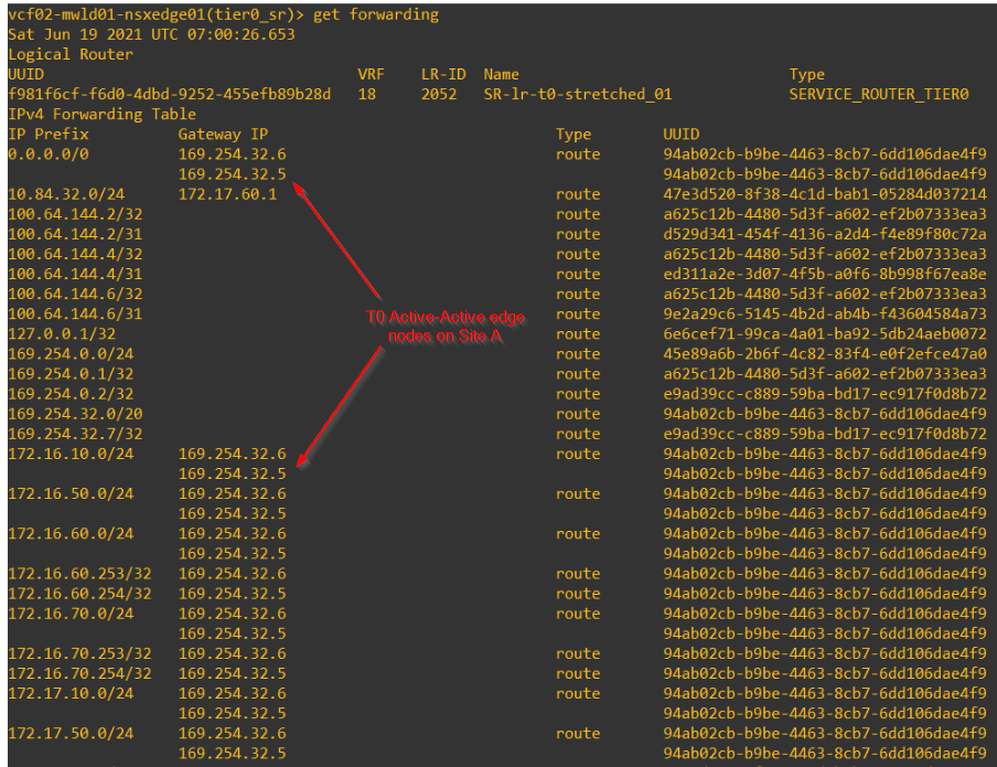 - Within the primary location, only the active edge node sits in the data path for N-S routing. Standby edge node uses as-path prepending for the advertised routes that makes it less preferable for the south bound traffic from the Leaf switches to the T0 gateway.