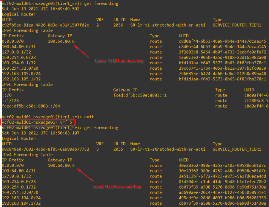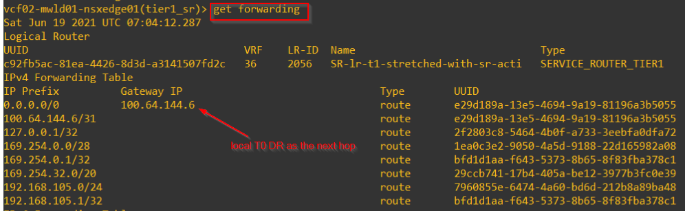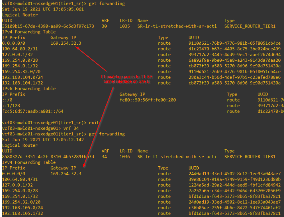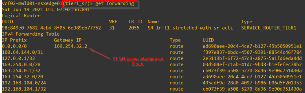 Forwarding tables of T1 SR on secondary locations with primary location on Site A will next-hop to local T0 DR construct.