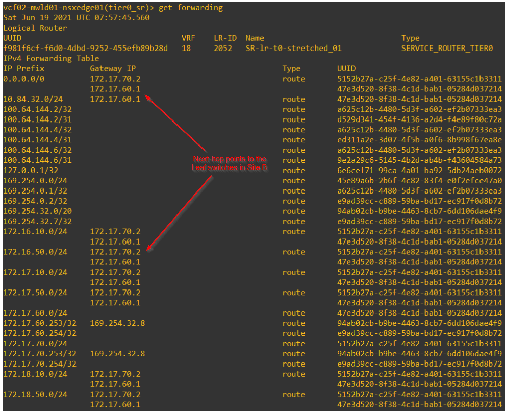 We should now see that the T1 gateway with SR Primary on Site B is switched over to Site A, the respective prefixes are advertised to the leaf switches northbound and the segments are accessible.