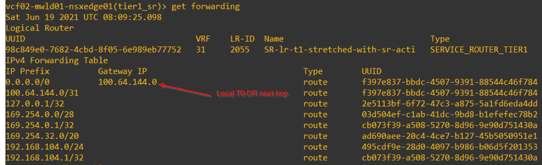 T1 SRs on secondary locations with themselves as SR primary will have the next-hop pointed locally to T0 DR.