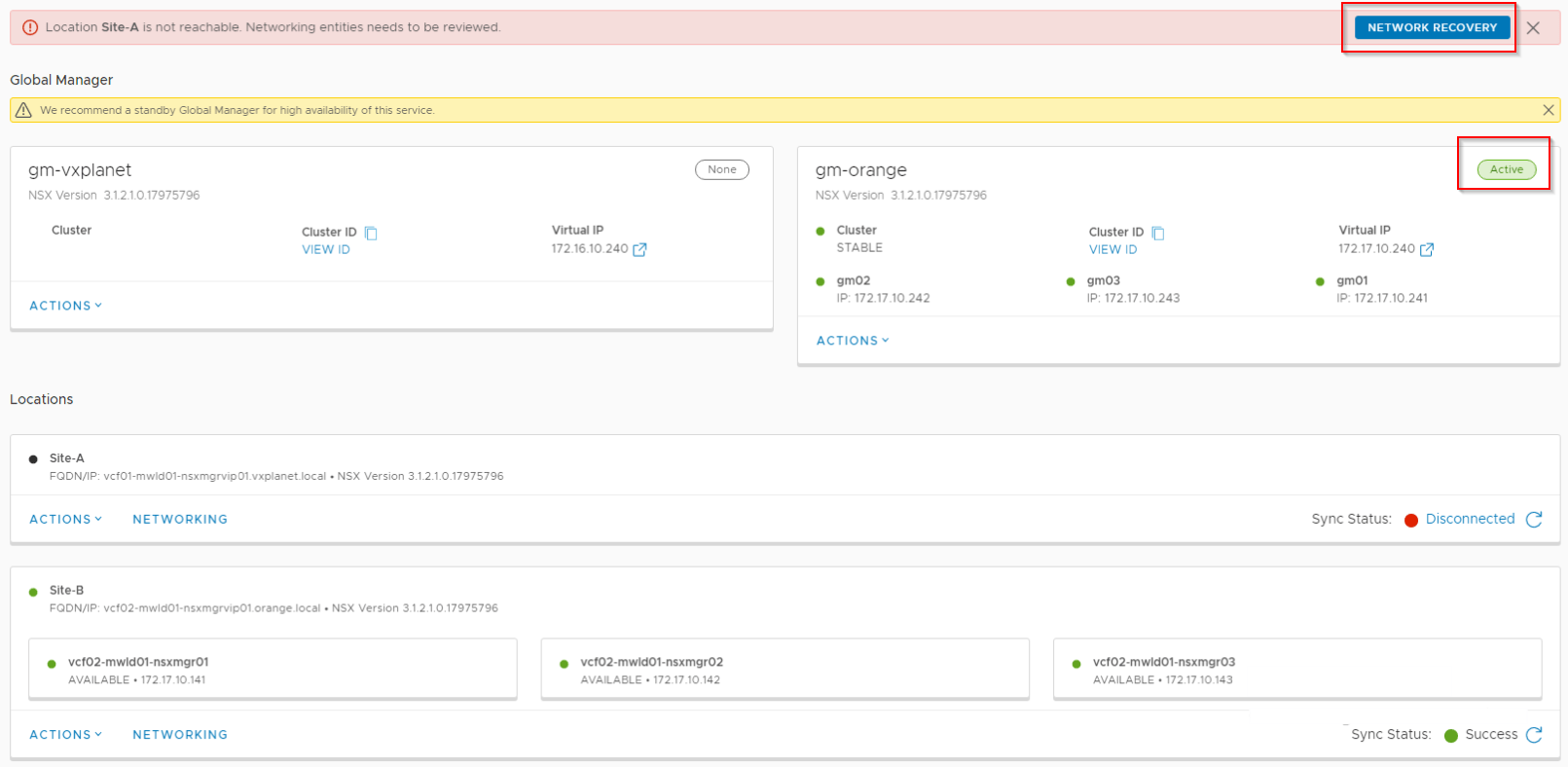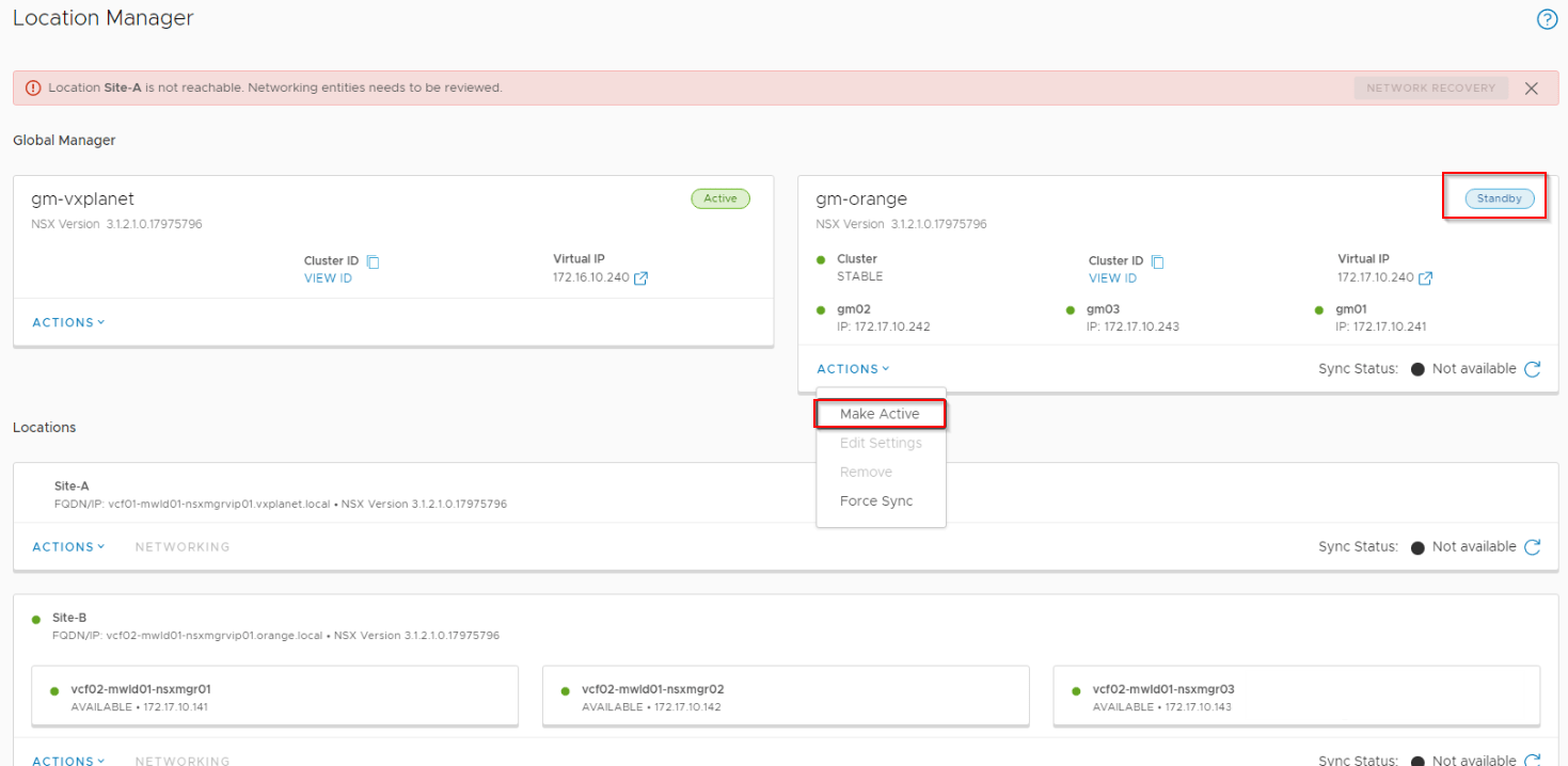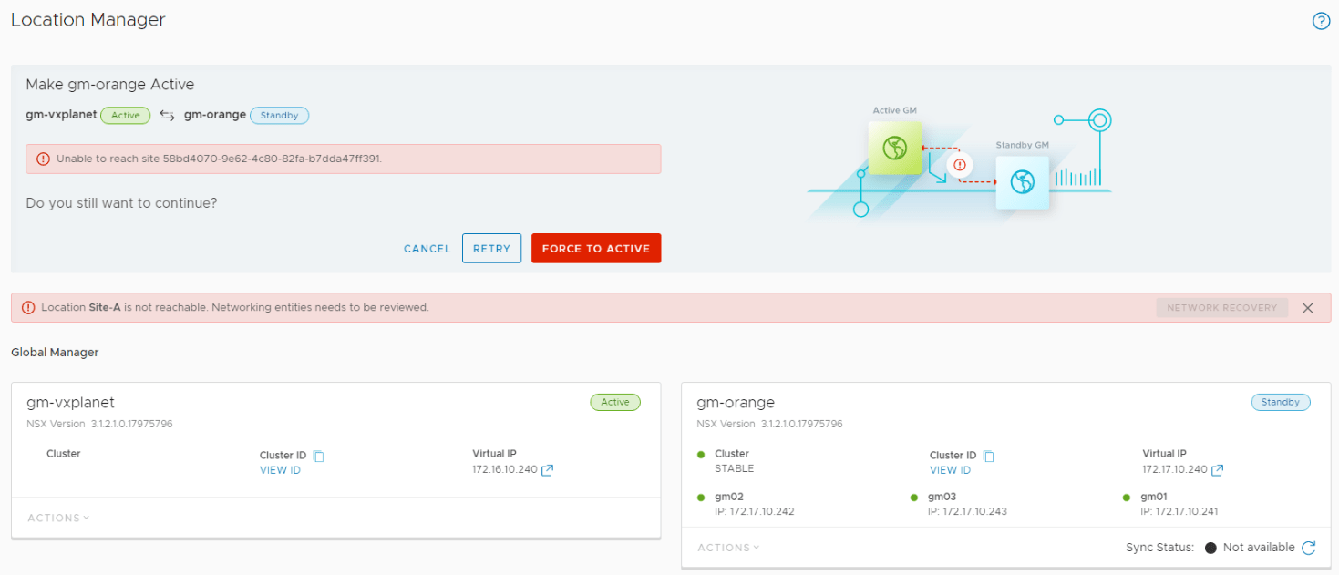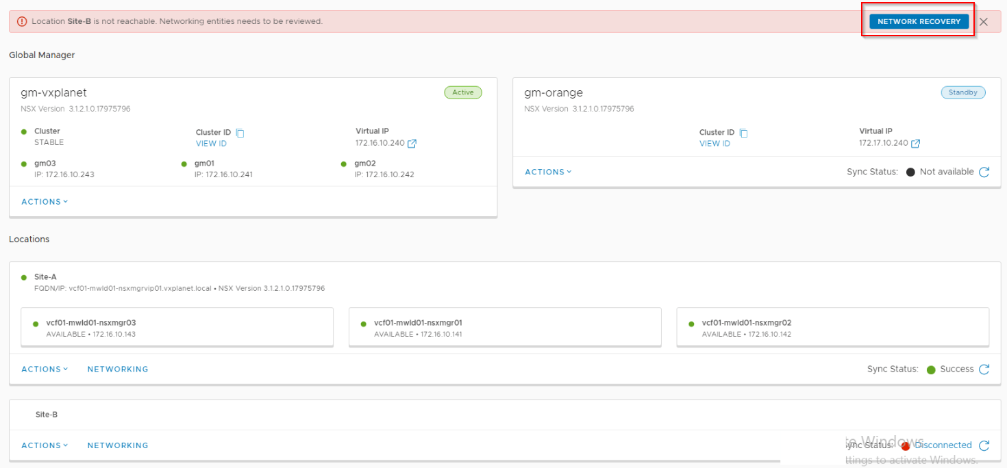 Let’s run network recovery and choose Site B to be the new primary location.