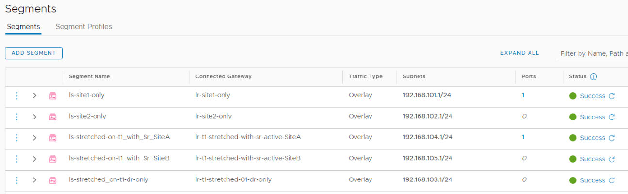 - segments attached to stretched T1 gateway with SR primary on that specific location.
