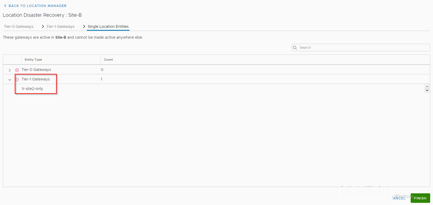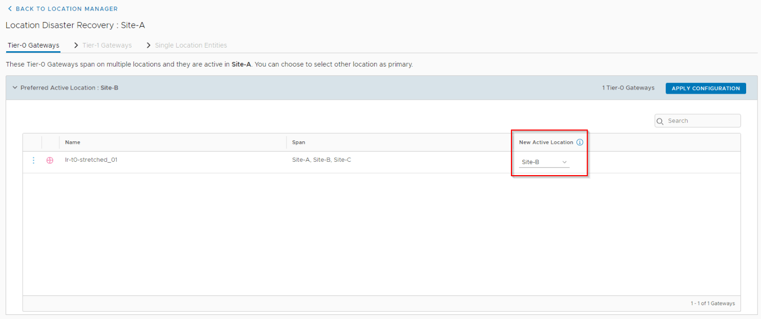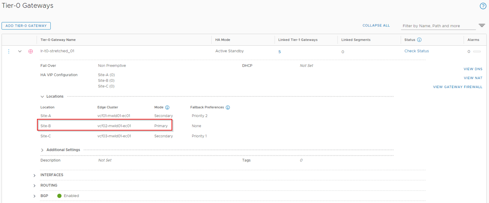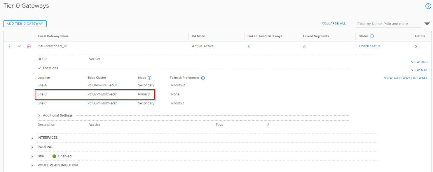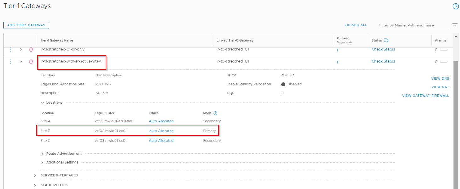 Also we see under the configuration for T0 and T1 gateways, the primary location as Site B is reflected.