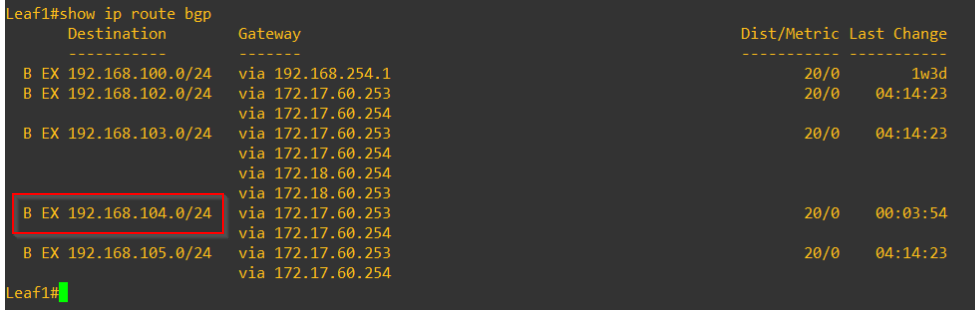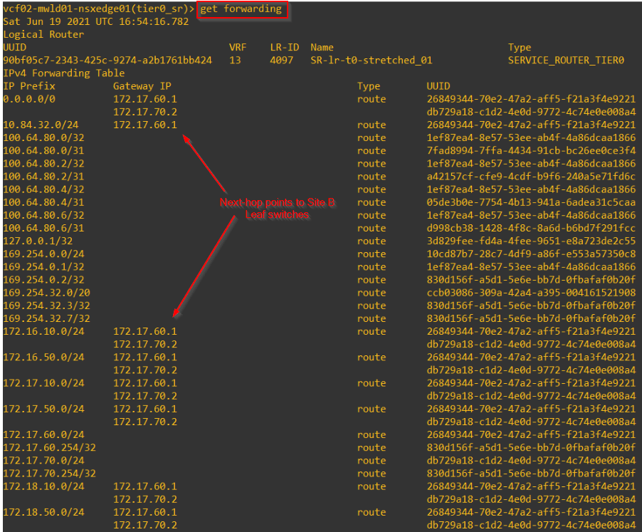 Below Leaf switch routing table is from Site B, notice we wont see 192.168.101.0/24 (non-stretched T1 on Site A) and 192.168.104.0/24 (Stretched T1 with SR primary on Site A) and hence connectivity to those segments is affected. The abovesaid segments are auto-recovered.