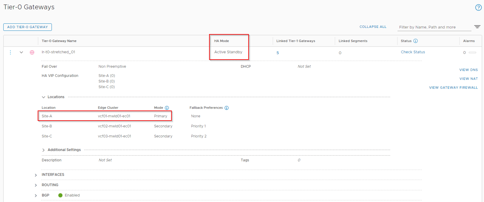 - Stretched Active-Standby Tier 0 Gateway with location Primary-Secondary