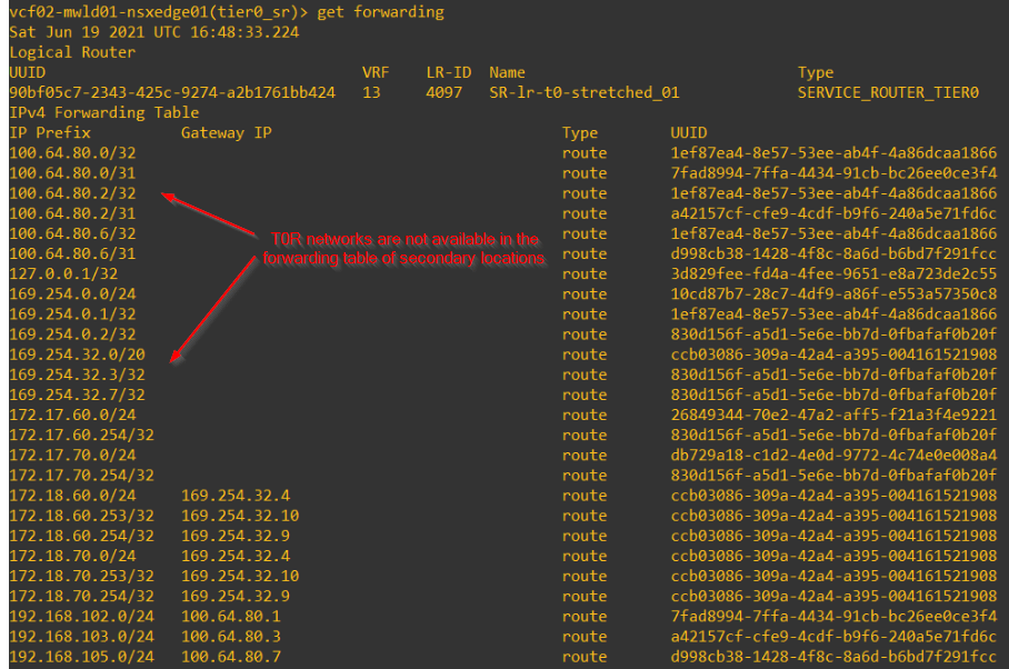 All secondary locations will have the forwarding tables of T0 SR construct next-hopping to the respective leaf switches on the location. This is because they no longer receive prefixes from primary location via inter-SR relationship. Almost a kind of local egress is happening on secondary locations at this stage and this causes assymetric routing.