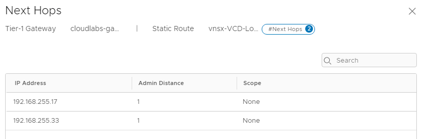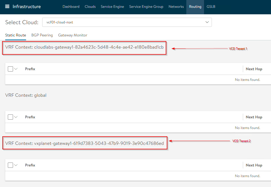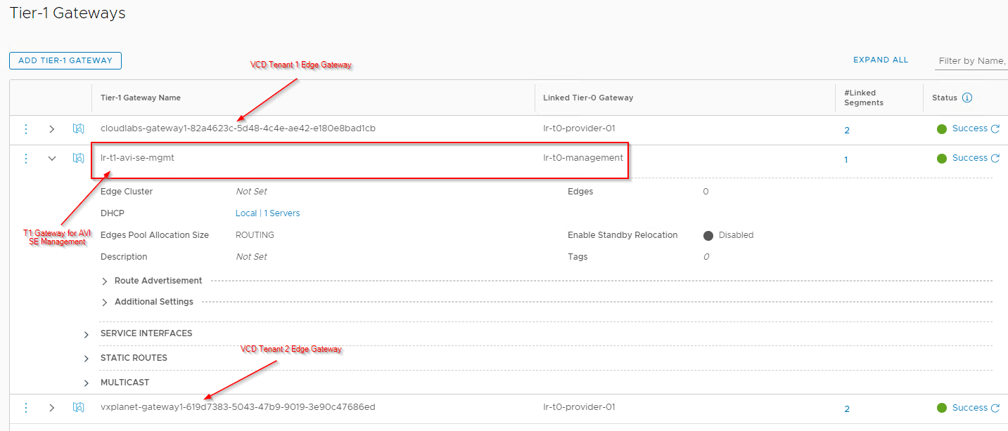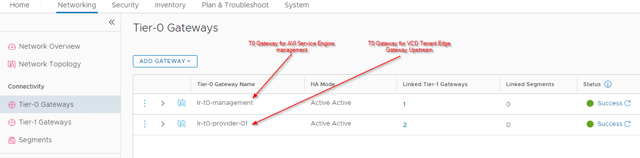 We have two T0 gateways – Provider T0 is where the VCD tenant gateways upstream to and Management T0 is for the management communication between ALB controllers and SE.