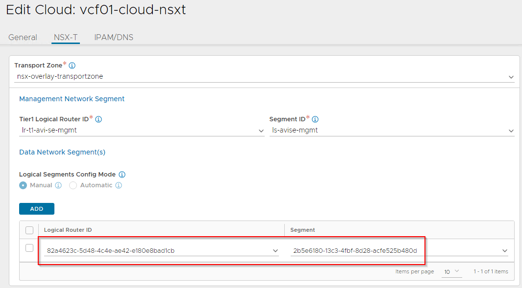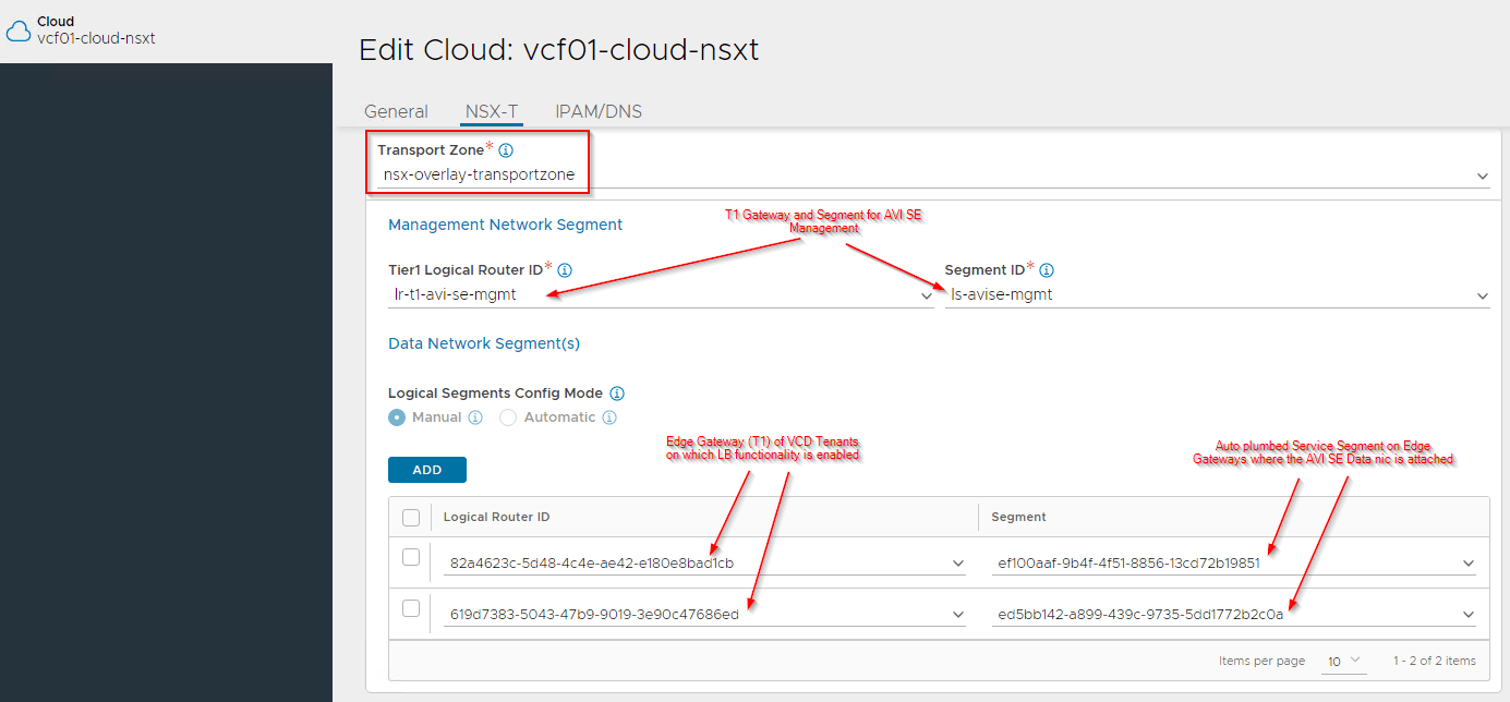 There is a 1:1 mapping between the NSX-T transport zone with the Cloud account. We specify the management T1 Gateway and Segment which was manually created as a pre-requisite in NSX-T manager earlier. The data networks will be auto plumbed by VCD whenever an OrgVDC gateway is enabled with the load balancer service.