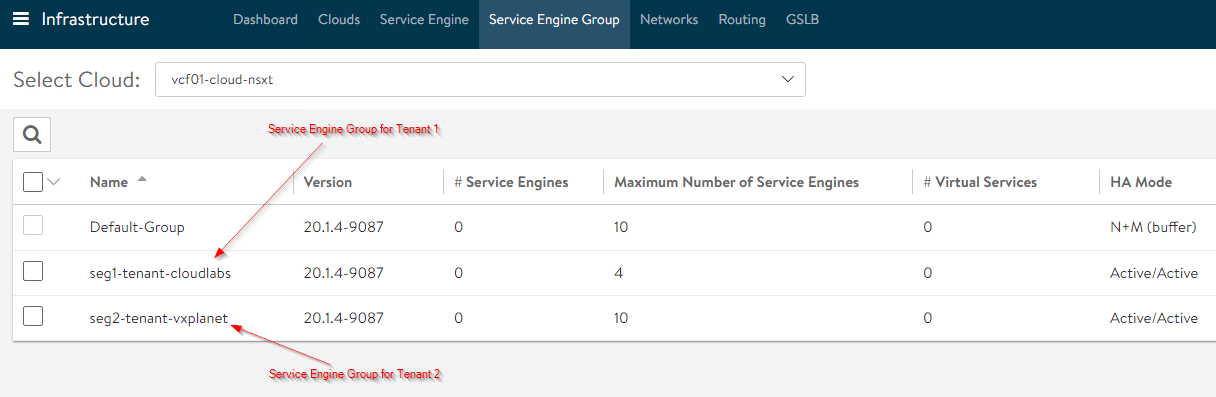 Based on the requirement and design, one or more SEGs are created which will later map to OrgVDC gateways. Make sure that the SEGs are created in the default ‘admin’ tenant in ALB. Non-admin tenants are currently unsupported.