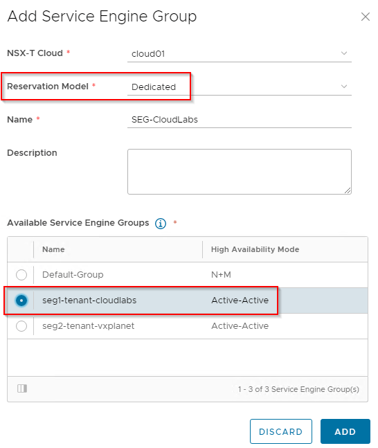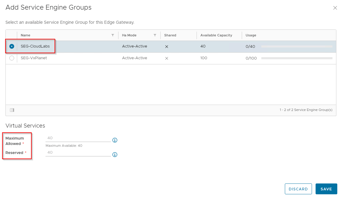 Now it’s time to import the Service Engine Groups (created in the ‘admin’ tenant in ALB). For this blog post, I have created two SEGs and will import them in Dedicated mode which will be 1:1 mapped with OrgVDC gateways of tenants.