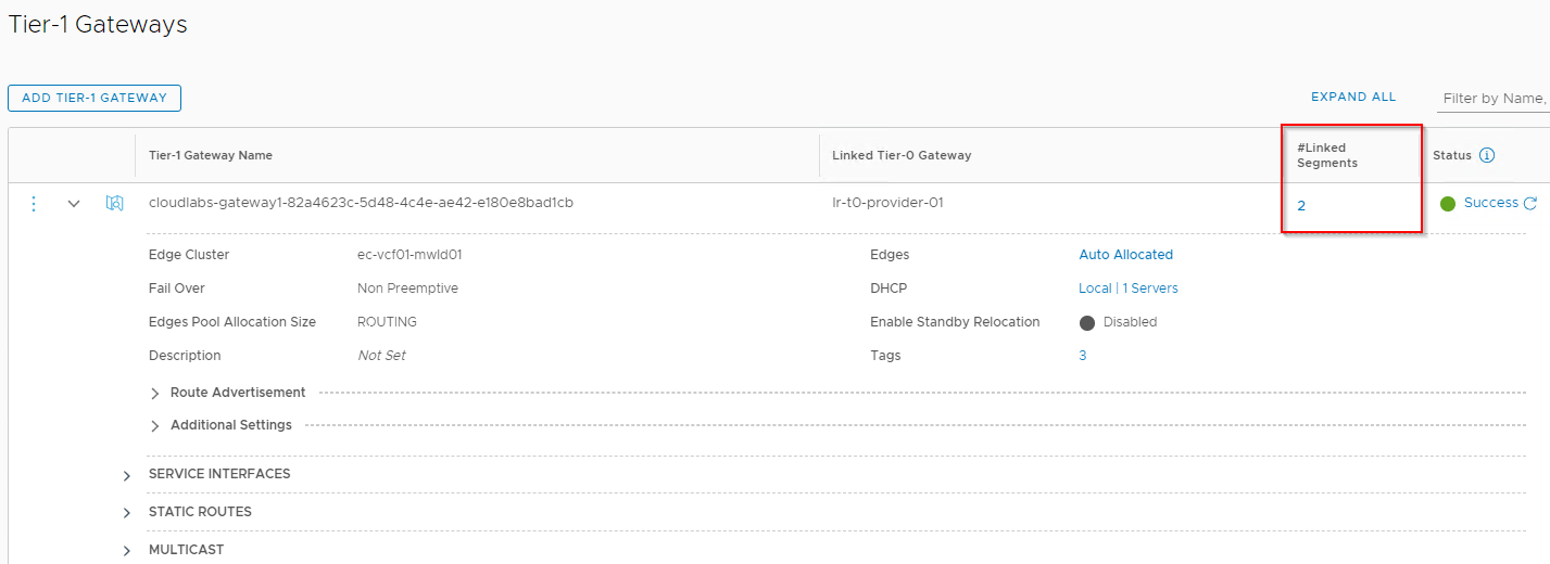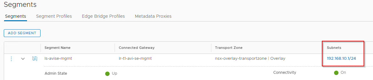 In the NSX-T UI, we should see a new service segment attached to the edge gateway where the SE data nics goes to.