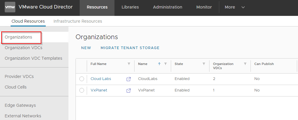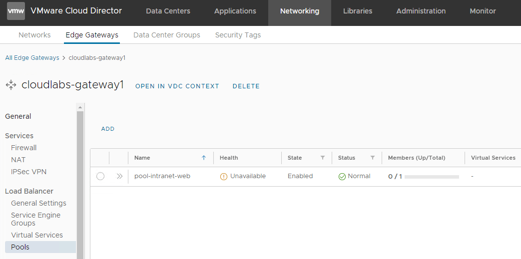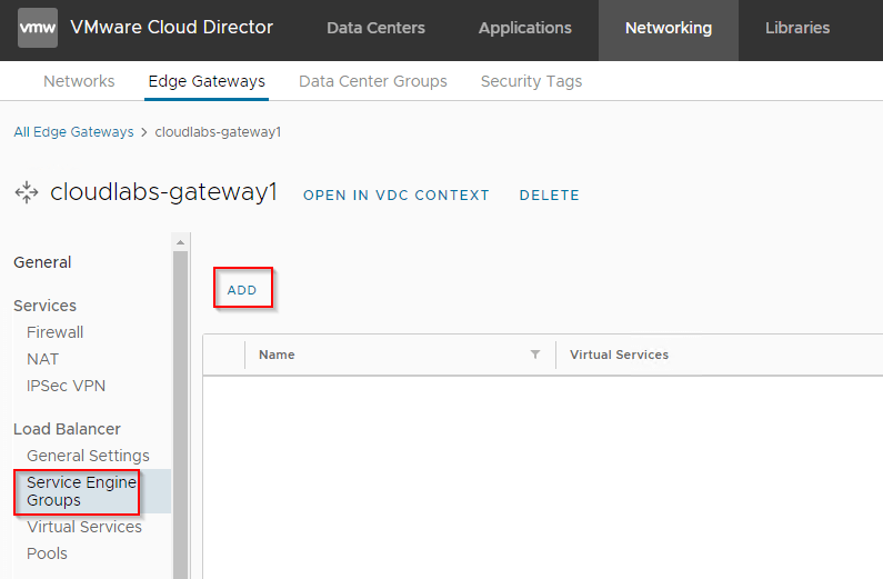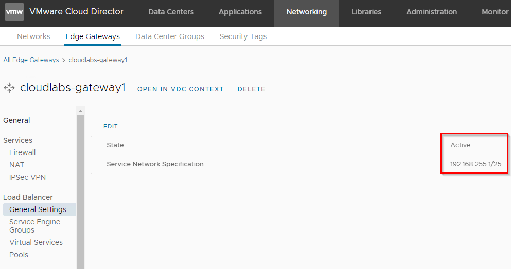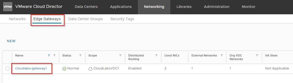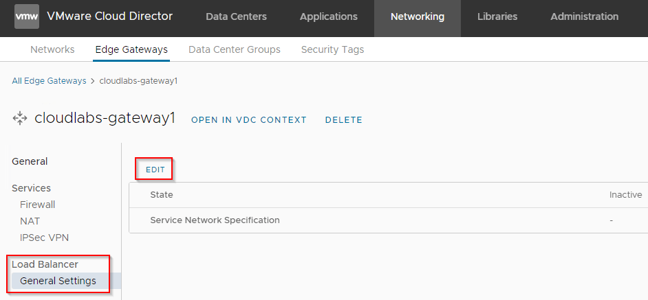 We have two VCD Organizations, and will enable load balancing service on the CloudLabs OrgVDC Edge Gateway. This is done from the Tenant Portal of CLoudLabs Org by the Organization administrator.