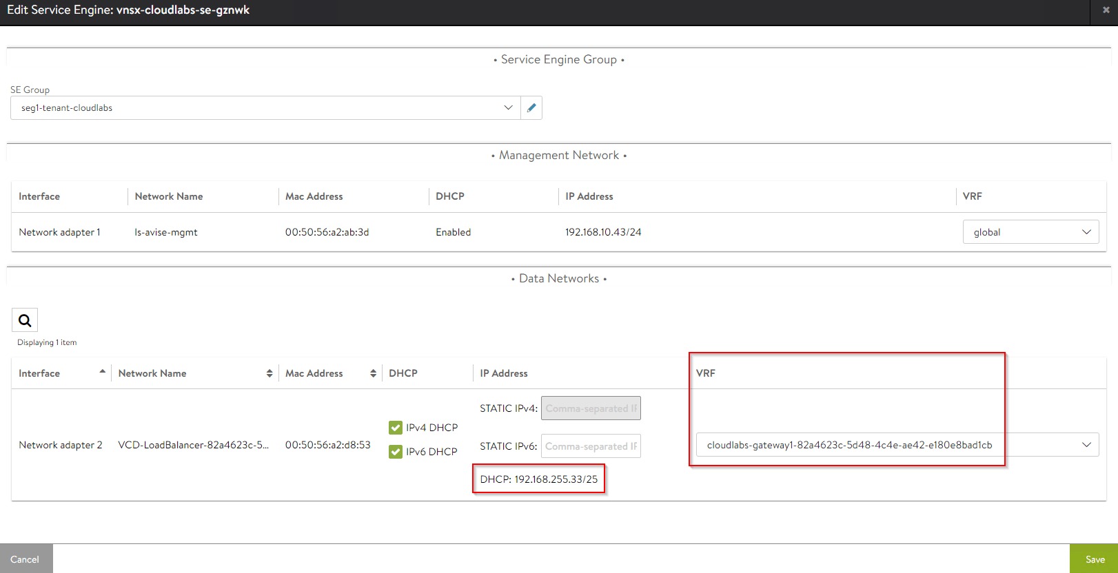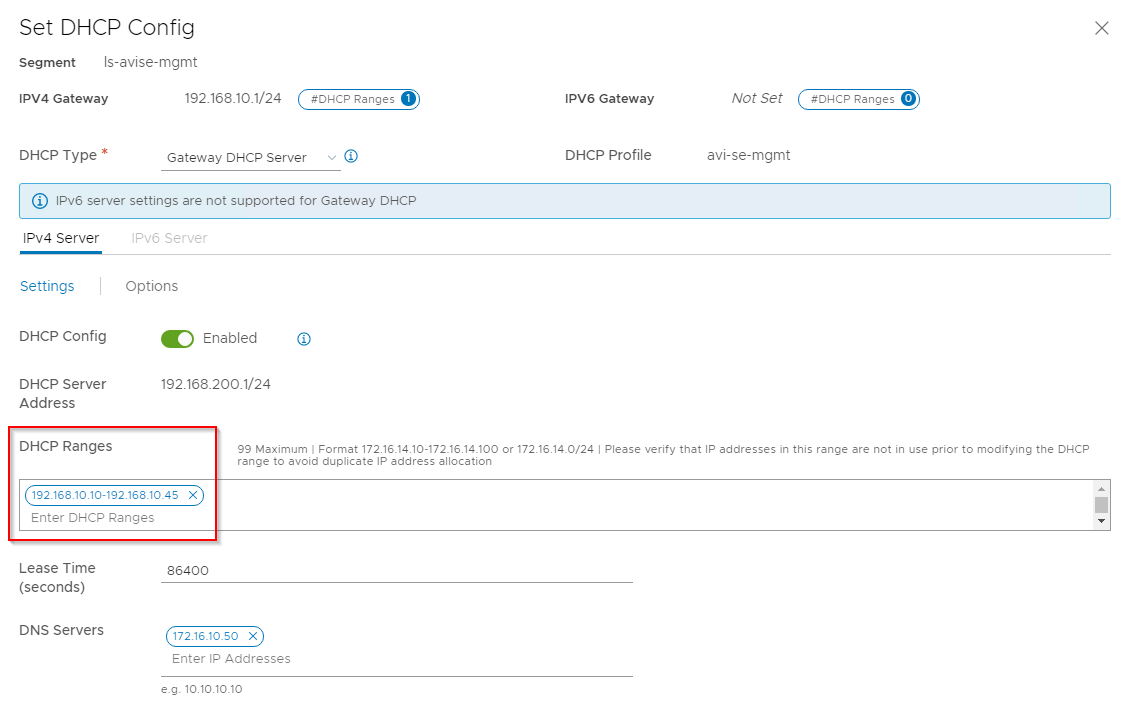 We have a dedicated segment for AVI SE management. DHCP is enabled on this management segment.