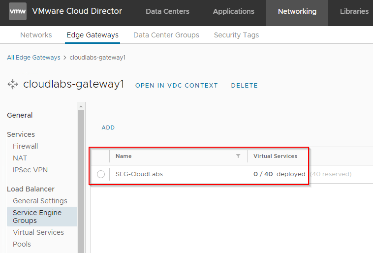 - Only the default ‘admin’ tenant in ALB is currently supported. All SEGs have to be created in the default admin tenant to be able to import into VCD. SEGs created in custom ALB tenants can’t be imported.