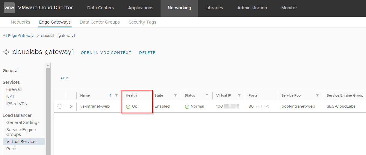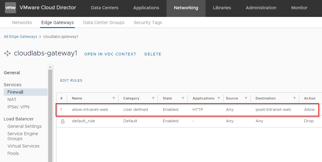 - The default gateway firewall rule on the VCD tenant edge gateway is set to deny all. Make sure to create an allow rule for the virtual service to be able to access the VS from external networks.
