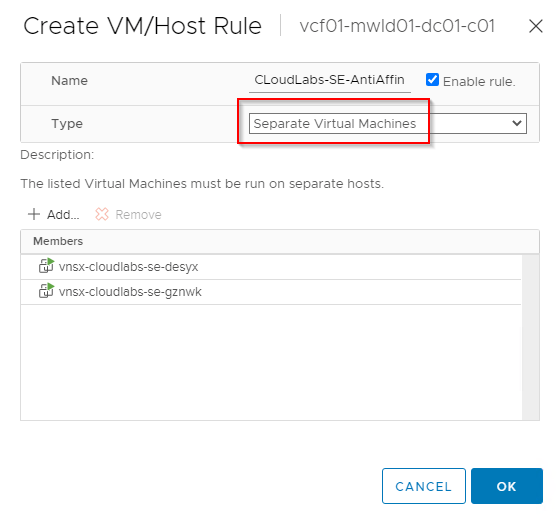 - Create vSphere anti-affinity rules for the SEs within the same SEG to force the placement on separate ESXi hosts.