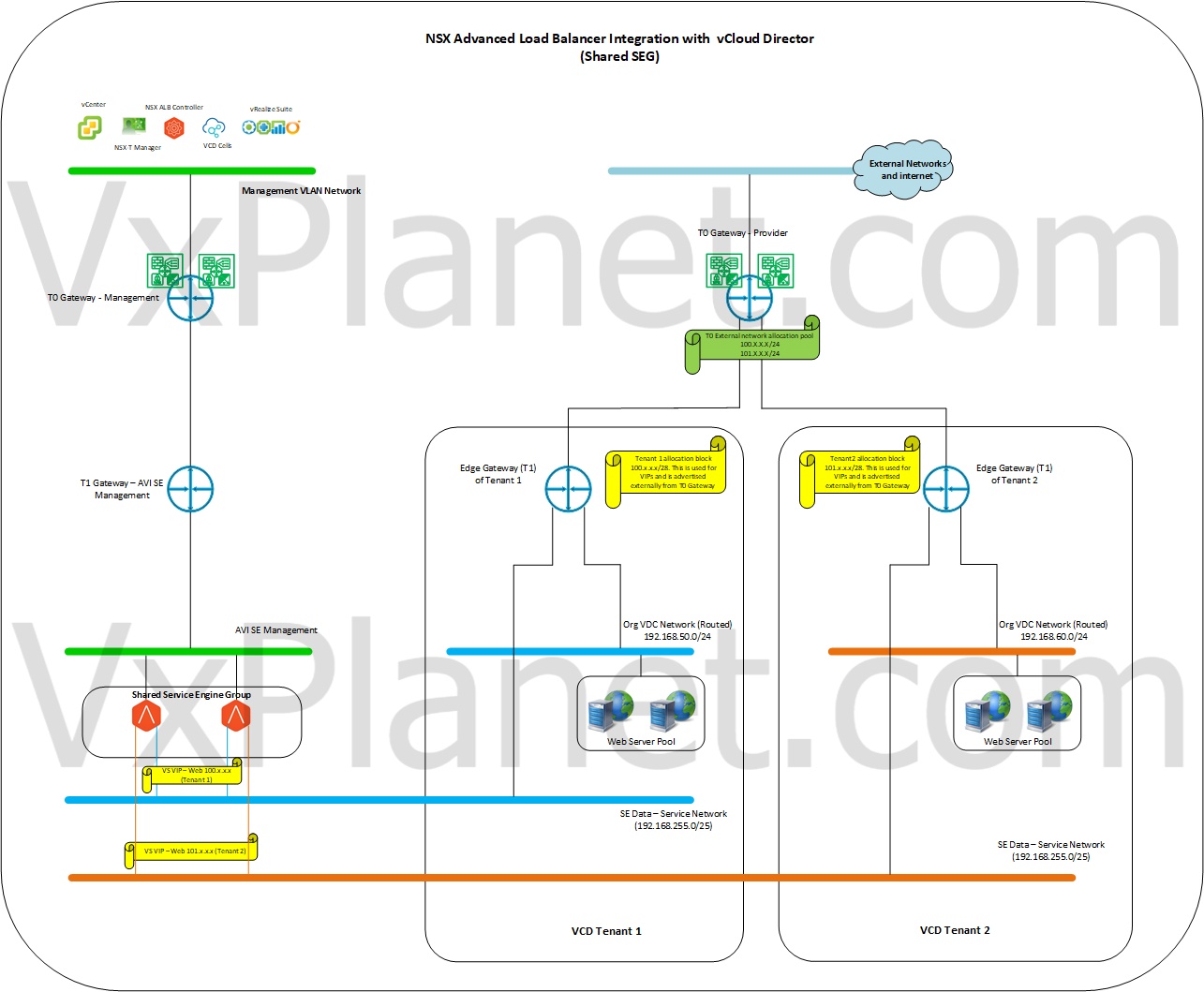 NSX ALB and VCD integration is achieved by creating an NSX-T Cloud in ALB and importing the same to VCD. In an NSX-T Cloud, the service engines are deployed on NSX-T logical segments – both management plane and data plane. ALB Controllers typically sits on the management VLAN network, in most cases L2 adjacent with the vCenter server and NSX-T managers.