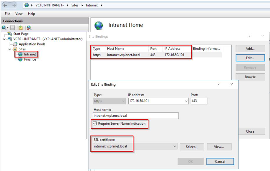 This is the Intranet application in Web01. The application has a single domain SAN certificate pointing to the application name – intranet.vxplanet.local