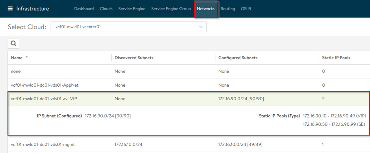 ALB discovers the vSphere networks from the Cloud account. We choose a specific Port Group for hosting the ALB VIPs for the Virtual Services. We also define an IP pool for the VIP addresses and the Service Engine data interfaces.